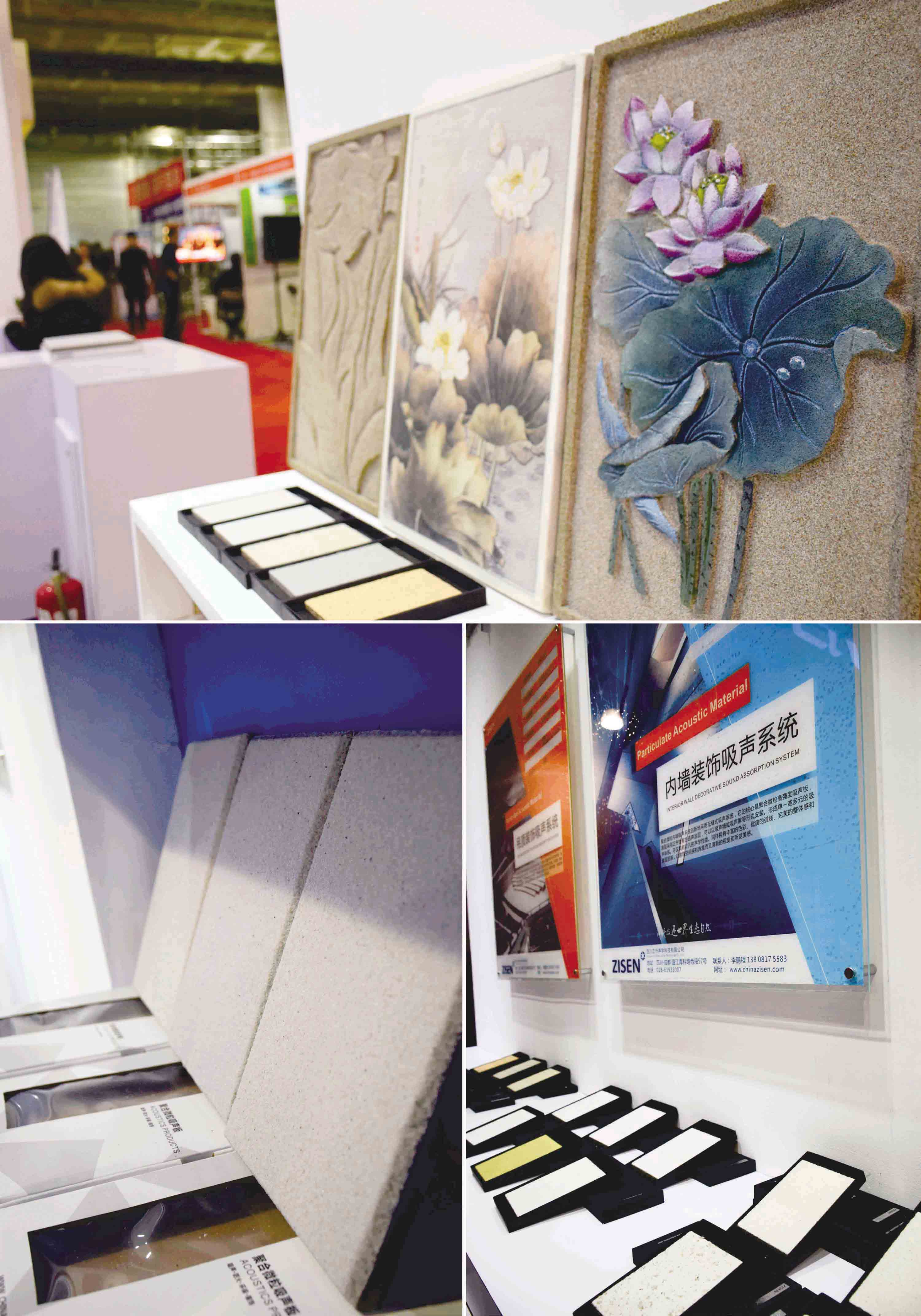在展會現場,我們主要介紹了聚合微粒材料的產品特點、產品性能及適用范圍等。通過幾個吸聲系統(tǒng)的說明來宣傳聚合微粒材料的隔音隔熱性能,用聚合微粒材料的基礎板材和裝飾面板來向來訪客戶直觀展示。